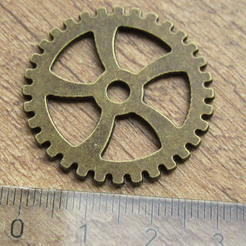 Tandwiel brons openDun tandwiel element met openingen. Met een ringetje te bevestigen of lijmen. Dit is een wat groter model, zie voor de uitersten in grootte de tweede foto.