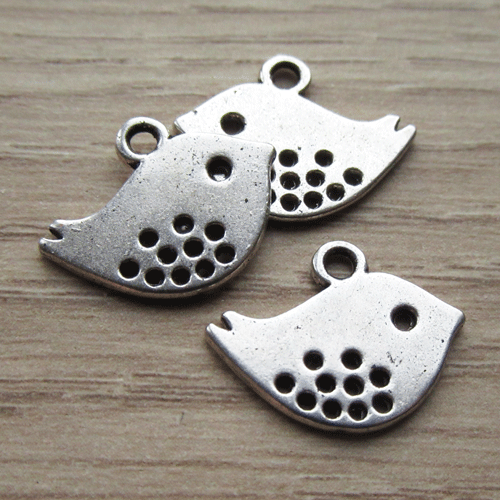 Lief bedeltje vogeltjeDit is eigenlijk een heel simpel hangertje. Het toont de contouren van een vogeltje en met gaatjes zijn de ogen en vleugeltjes aangegeven. Plat, licht bedeltje, aan beide zijden hetzelfde. In een zakje met 5 stuks geleverd. Leuk aan een bedelarmbandje of in oorbellen.