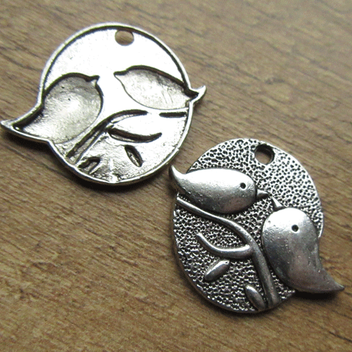 Bedeltje vogels op takDoor de grootte van dit hangertje erg leuk om aan een ketting te hangen. Zelfs aan een veterkoord al leuk! Het hangertje is plat en aan de achterzijde hol (zie tweede foto). Het is een lief plaatje, waar je zelfs nog een klein plaksteentje op zou kunnen plakken.