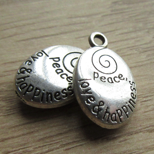 Ovaal gevormde bedel met de tekst peace, love & happiness. Voor - en achterkant zijn hetzelfde, zie foto.