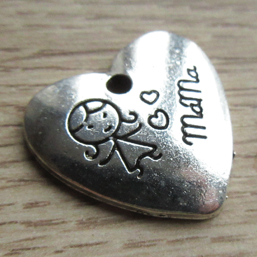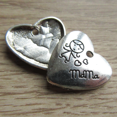 Op de tweede foto zie je de voor- en achterzijde. De achterkant van het bedeltje is hol. Leuk hangertje om aan een cadeautje voor mama te hangen!