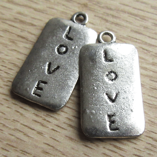 Bedeltje 'love'. Antiek zilverkleurig rechthoekig hangertje. Achterzijde hetzelfde.