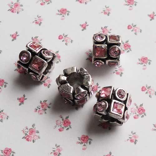 Mooie kraal met roze strasstenen. Geschikt voor het dik elastiek, of bijvoorbeeld op een dubbele draad imitatie leerveter, maar ook voor de bekende armbandsystemen.