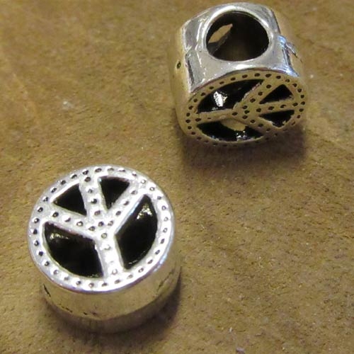 Peace kraal opengewerkt. Deze metalen kraal is geschikt voor de verschillende armbandsystemen. Door de grote opening ook heel leuk voor sieraden met veterkoord of waxkoord.