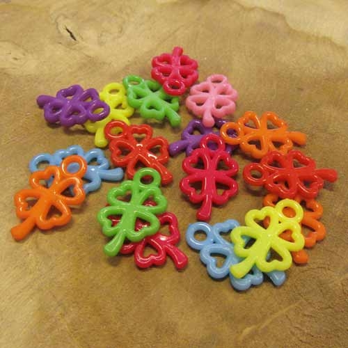 Leuke voordelige mix met kunststof hangertjes in de vorm van een klavertje vier. Open bedeltje in diverse vrolijke kleuren.
