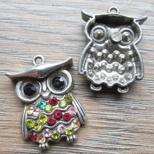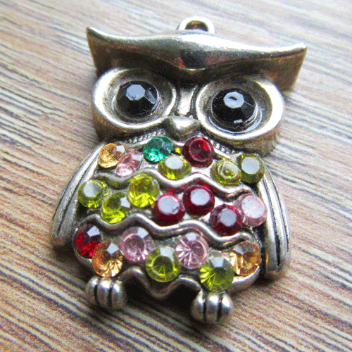 Metalen hanger uiltje met een lijfje dat bezet is met gekleurde strassteentjes. Dat maakt dit bedeltje gelijk lekker vrolijk. Meer dan een eenvoudige ketting heeft dit hangertje niet nodig.