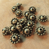Ronde kraal met ribbelrand erom heen• Maat: 9 x 5 mm, rijggat 2 mm.• Per 16 stuks.De ribbelrand rondom deze kraal geeft de kraal het uiterlijk van een planeet met een band erom heen: Saturnus dus, vandaar de naam.Leuk ter afwisseling tussen kralen van 8, 9 mm. Dan komt de kraal mooi tot zijn recht.
