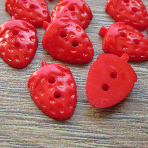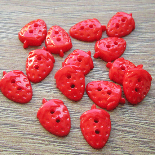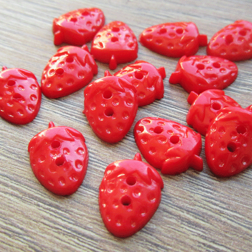 Kunststof knopen in de vorm van aardbeitjes met twee gaten. Zijn ze niet lief?