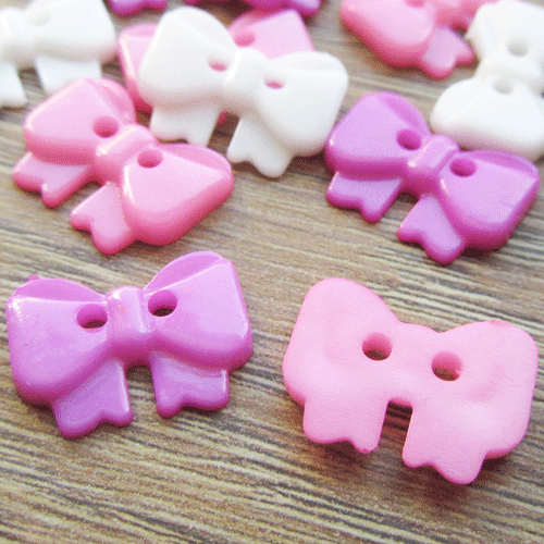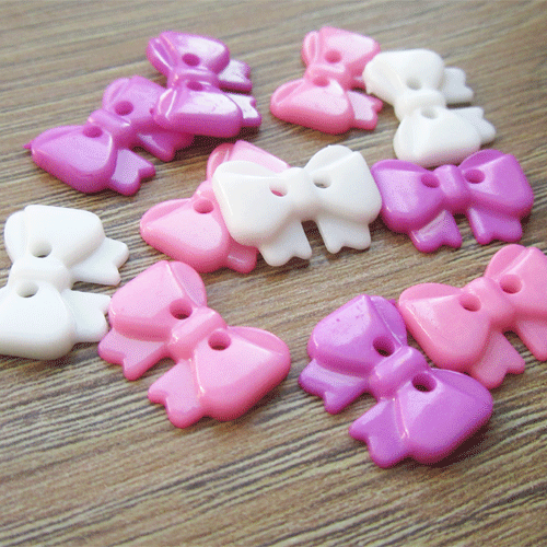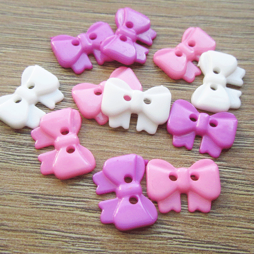 Deze schattige knoopjes zijn in de vorm van een strikje. De achterkant is glad. In een leuke mix met de kleuren wit, roze, paars, ca. 15 stuks per kleur.