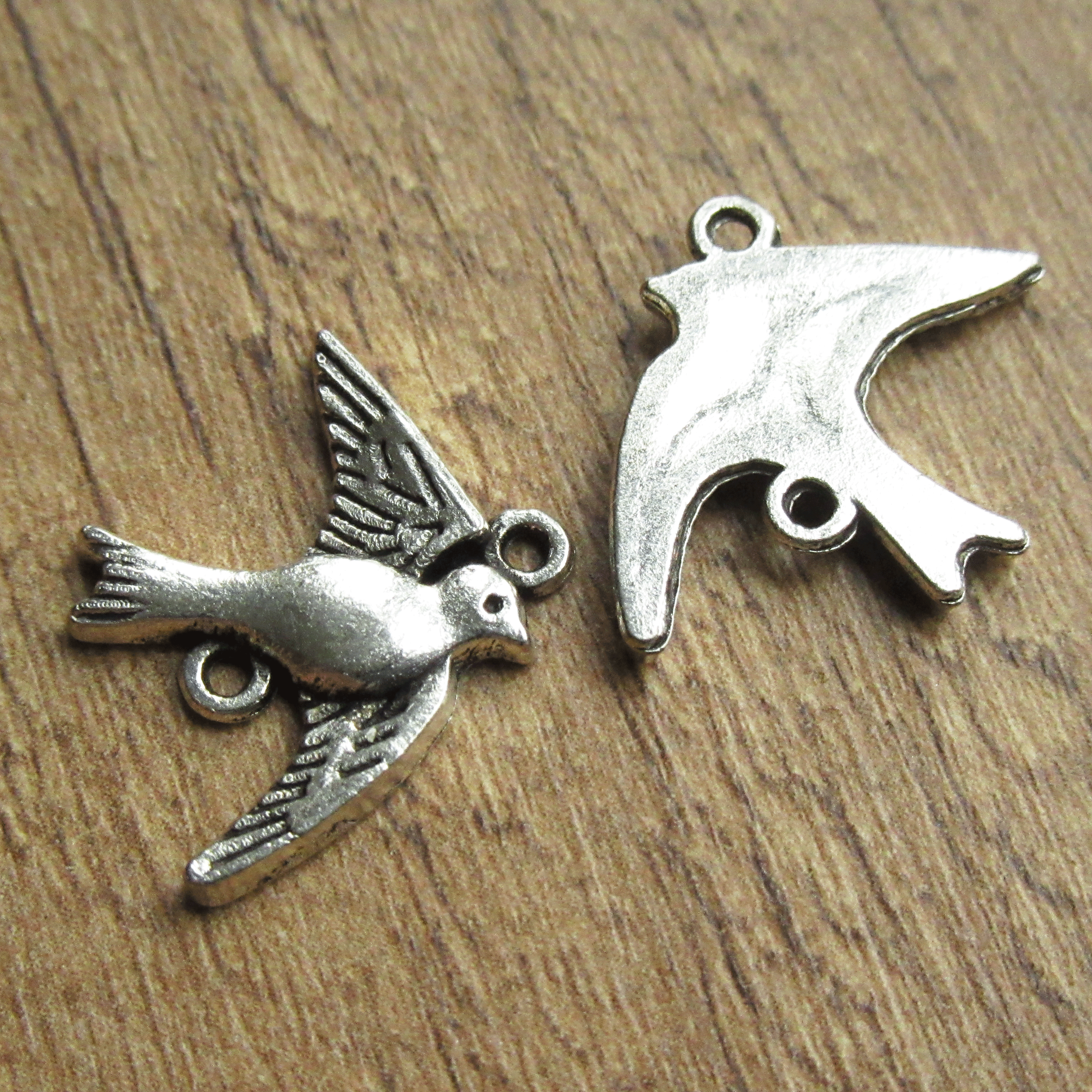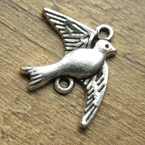 Tussenstuk vogeltjeOp de foto zie je links de voorkant en rechts de achterkant van dit tussenzetsel. Het is een metalen elementje met een bevestiginsoog aan de bovenkant op het kopje en één aan de onderkant tegen de staart aan. Het tussenstuk is leuk te gebruiken in een ketting of armband.