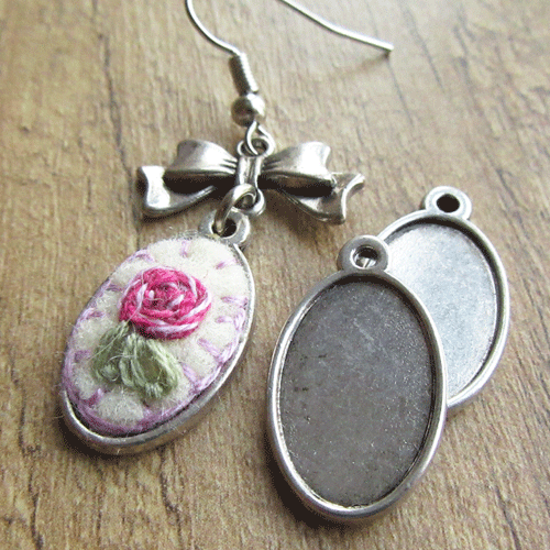 Geschikt voor de kleine ovaal gevormde cabochons zoals de lotusbloem en de cabochon met bloemreliëf. Deze passen niet precies in de zetting, maar met voldoende lijm lukt het prima. Ook geschikt voor epoxy hars of een eigen invulling, zoals op de foto met vilt.