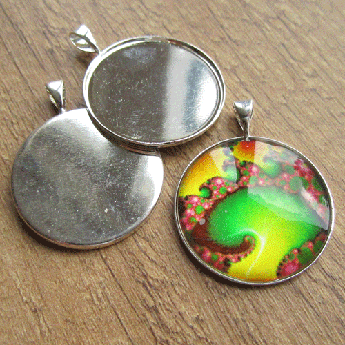 Basic zetting rond voor 25 mm steenMooie basic gladde zetting voor een plaksteen of cabochon van 25 mm groot. Lichte hanger door het gebruik van dun metaal. Niet voor heel intensief gebruik..Dus niet als sleutelhanger of zo.