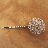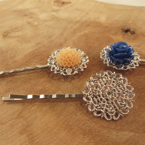 Schuifspeld voor in het haar met 25 mm groot filigraan plakval voor cabochon. Leuk om juist niet zo'n grote plaksteen op te plakken, zodat je nog een mooie rand van het filigraan ziet.