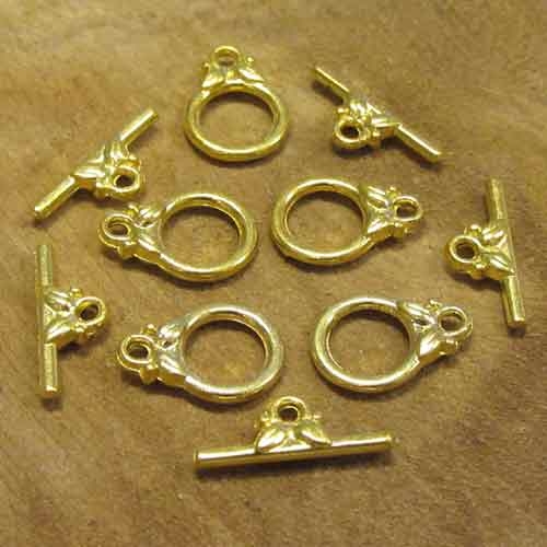 Goudkleurige kapittelsluitingGoudkleurige metalen sluiting, klein model met een oog en staafje. Deze sluitingen zijn handig voor mensen die moeite hebben om een sluiting open te krijgen met een veertje en een pinnetje.
