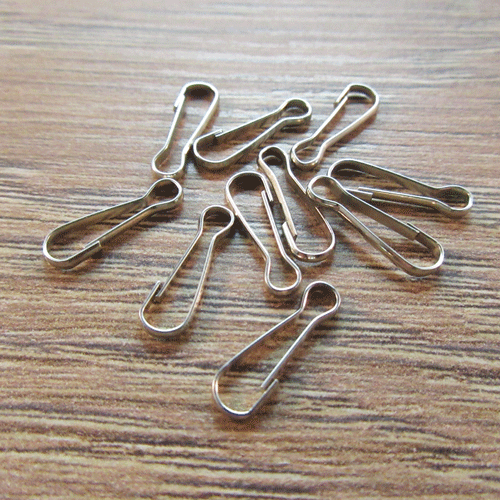 Musketonhaak klein: je haakt het er zo aanDit haakje is een eenvoudig hulpmiddel. Je kunt het zonder gereedschap ergens aanhaken en op dezelfde manier kun je er ook een labeltje of iets dergelijks aandoen.