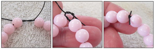 Vraag hulp aan een volwassene als het toch niet lukt. Een trucje is nog om de knoop in te smeren met een beetje blanke nagellak. Wel even goed laten drogen. Dan knip je, zoals je op het laatste plaatje ziet, het elastiek af, zover van de knoop af als de helft van je vinger dik is ongeveer. En als je dan de kralen een beetje over de knoop heen schuift, zie je het knoopje helemaal niet meer.