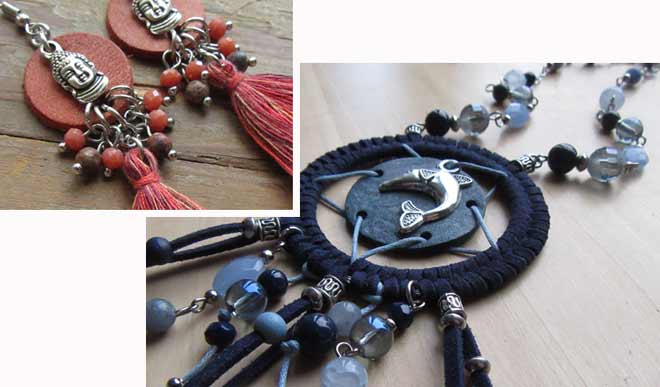 Deze onderdelen zijn officieel cabochons, maar kunnen met een gaatjesmaker worden omgetoverd tot leuke tussenzetsels of hangertjes, zoals je op bovenstaande foto kunt zien. Het leerstuk geeft jouw sieraad een natuurlijke, spirituele of bohemian uistraling. De grotere leerstukken zijn ook leuk om te gebruiken in het midden van een dromenvanger. Dat omtoveren van de leerstukken geldt ook voor de leer hangers: maak er een gaatje bij en je hebt een origineel tussenzetsel!