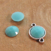 Eenvoudige kunststof cabochon, plaksteen met facettten. Past goed in deze zetting.