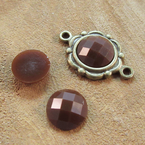 Eenvoudige kunststof cabochon, plaksteen met facettten. Past goed in deze zetting.