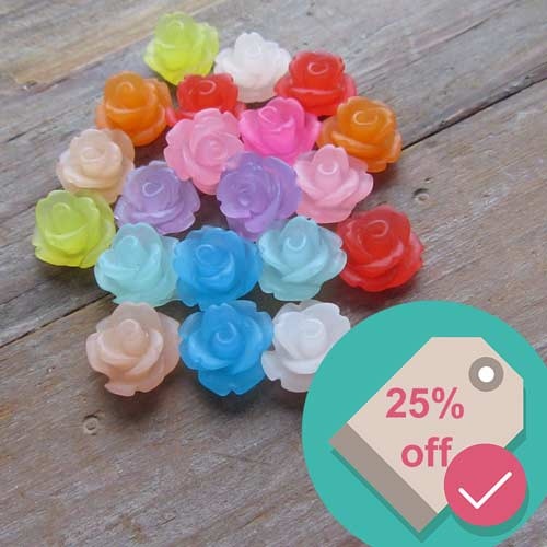 Deze plakroosjes zijn qua maat vergelijkbaar met de roosjes hieronder. Ze hebben geen rijggat dus ze zijn niet als kralen te gebruiken. Door de vlakke achterkant (flatback) wel te lijmen op oorstekers, bedels, enz.