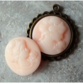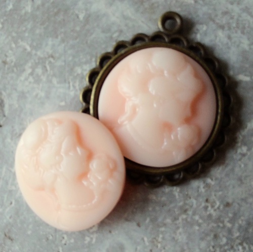 Plat ronde camee in zacht oranje met dame erop in lichtere tint.