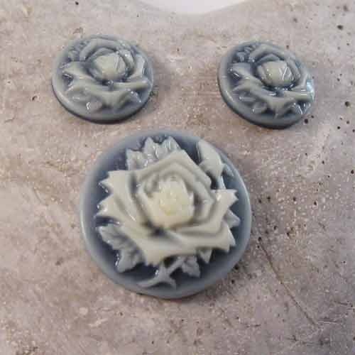 Camee rond grijsDeze plaksteen is verkrijgbaar in 20 mm en in 12 mm maat, zodat je er leuke sets van kan maken van hanger en bijpassende oorbellen. De camee is van kunsthars oftewel resin en een lichte roos op grijze achtergrond.
