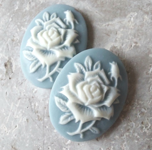 Camee ovaal met roosFlatback camee met een blauwe achtergrond en daarop in wit een roos. Het materiaal van de plaksteen is kunsthars, ook wel resin genoemd. De vlakke achterzijde lijm je met bijvoorbeeld sieradenlijm in een mooie zetting. Je hebt dan een mooie hanger, die je naar eigen idee kan gebruiken.
