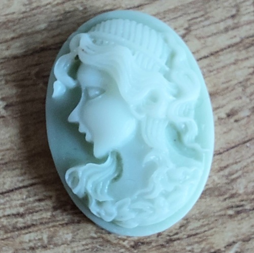 Camee ovaal met dameFlatback camee met een gekleurde achtergrond en daarop in wit een dame. Het materiaal van de plaksteen is kunsthars, ook wel resin genoemd. De vlakke achterzijde lijm je met bijvoorbeeld sieradenlijm in een mooie zetting. Je hebt dan een mooie hanger, die je naar eigen idee kan gebruiken.