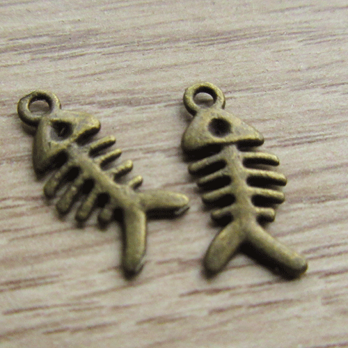 Metalen bedeltje in antiek bronskleur van een vissengraat. Dit is een wat stoerder hangertje, je ziet het wel bij de Gothic scene. De vissengraat wordt ook vaak gebruikt als tatoeage. Een echt symbolische betekenis heb ik niet kunnen vinden, waarschijnlijk past het gewoon bij een wat stoerder imago omdat het een skelet van een vis is.