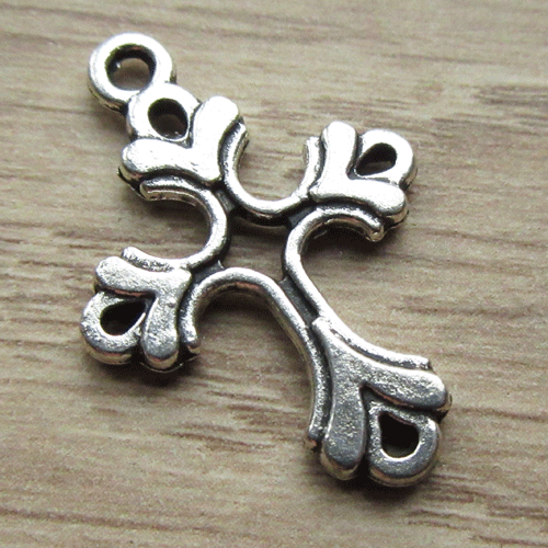 Bedeltje kruisje met overal openingen. In het midden, aan de zijkanten, onderaan. Het oogje aan de onderkant is groot genoeg om daar nog wat aan te hangen.