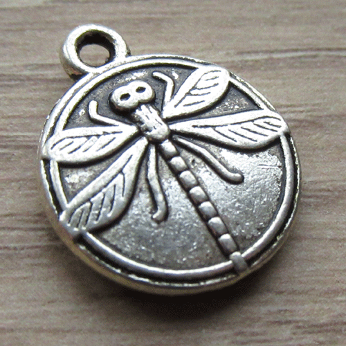 Plat ronde bedel met het reliëf van een libelle erop. Het bedeltje is antiek zilverkleurig en aan beide zijden hetzelfde.