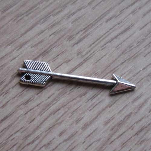 Bedel pijlDeze metalen bedel pijl is glad aan de achterkant. Let op: deze heeft een kleine opening, dus dunne ringetjes nodig. Leuk in combinatie met de boog.