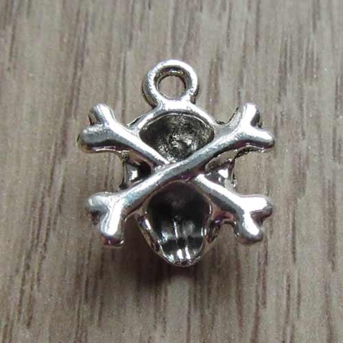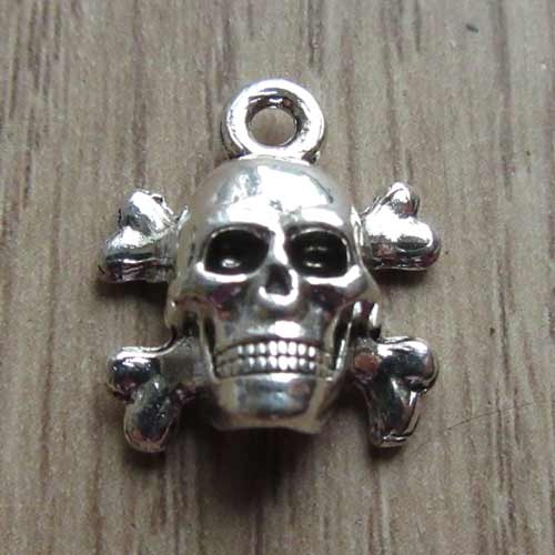 Bedeltje schedelDit hangertje is hol aan de achterzijde. Het schedeltje rust op twee kruislings geplaatste botten.