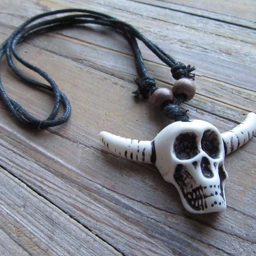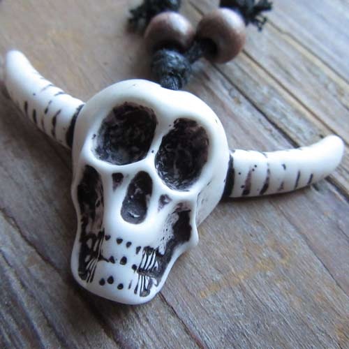 Korte ketting van waxkoord, te verstellen met schuifknoop. Met houten kralen. De bedel is van kunsthars in imitatie bot look.