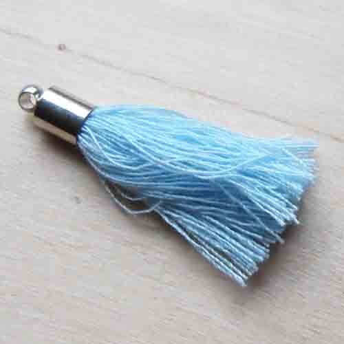 Kwastje lichtblauwDoor het eindkapje heeft dit flosje een wat luxere uitstraling. Te gebruiken in allerlei sieraden maar bijvoorbeeld ook als decoratie op kaarten.