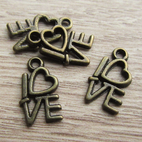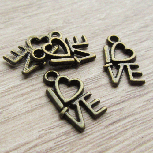 Dit is een lief klein hangertje dat je zo ergens aan hangt. Een beetje vierkant van vorm en klein van formaat. Het hangertje is van bronskleurig metaal. De tekst love maakt van dit bedeltje een lief hebbedingetje dat je als extra detail aan kettingen, armbanden of tashangers hangt.
