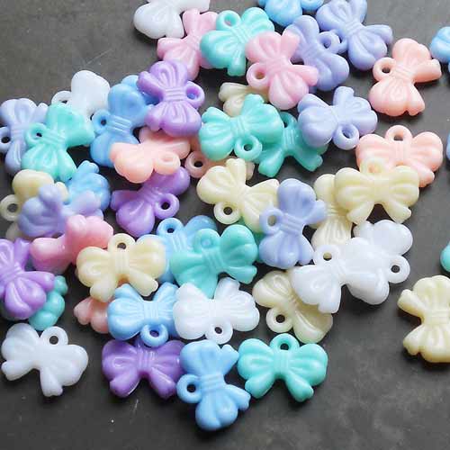Lief bedeltje van kunststof. In schattige kleuren. Welk meisje wil nou niet zo'n leuk strikje aan haar oorbellen of bedelarmbandje? Leuk te combineren met de kralenmixen in dezelfde tinten.