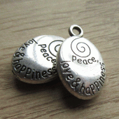 Ovaal gevormde bedel met de tekst peace, love & happiness. Voor - en achterkant zijn hetzelfde, zie foto.