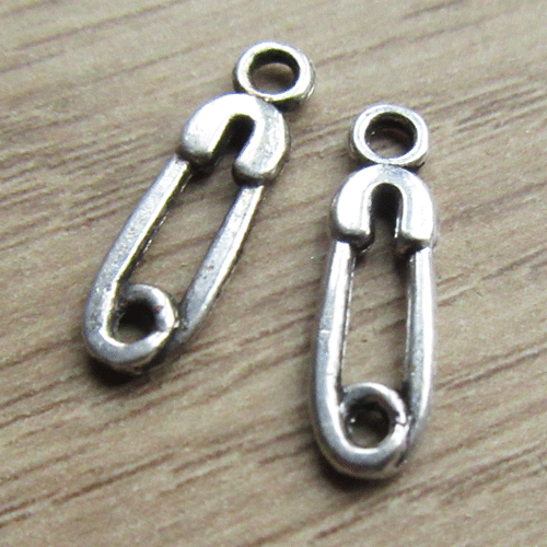 Vijf kleine bedeltjes in de vorm van een veiligheidsspeld.
