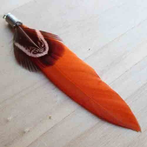 Duo veertje oranjeDit veertje bestaat eigenlijk uit een langer veertje in oranje en een korter veertje in bruintinten. Vandaar de naam duo veertje. Leuk voor in boho sieraden of dromenvangers.