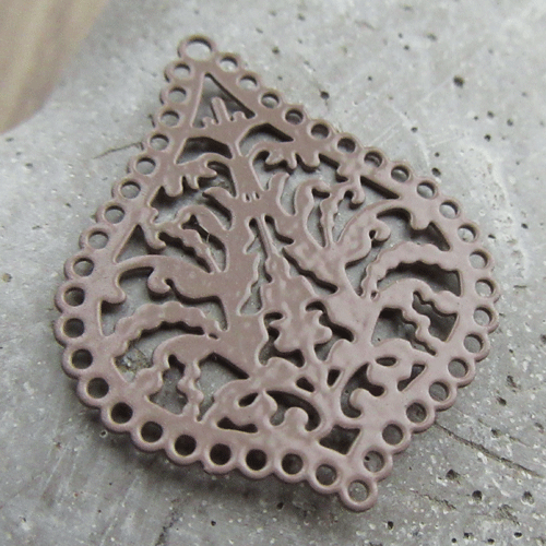 Druppelvormige bedel of hanger van dun metaal. Deze hanger loopt uit in een punt en heeft rondom oogjes om iets aan te hangen.