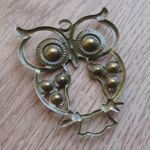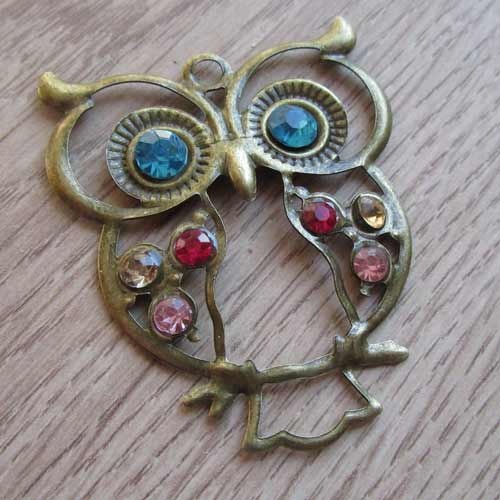 Filigraan hanger uil met strasBronskleurige hanger die licht van gewicht is, door het dunnere materiaal. Leuk afgewerkt met multicolor strasstenen.