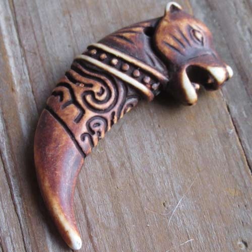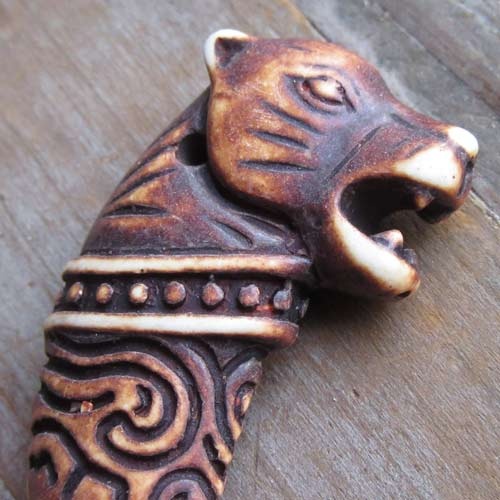Hanger in de vorm van een wolfstand. Grote hanger met bovenaan de kop van een wolf, mooi bewerkt met diverse patronen.