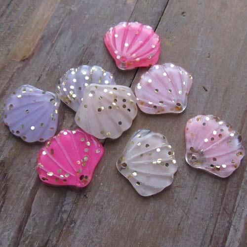 Leuke hangers in schelpvorm. Aan de voorzijde ook met het reliëf van een Jacobsschelp en gouden glitter. De achterzijde is glad.