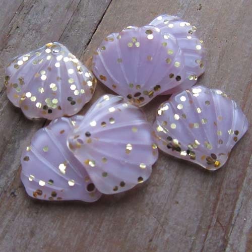 Leuke hangers in schelpvorm. Aan de voorzijde ook met het reliëf van een Jacobsschelp en gouden glitter. De achterzijde is glad.