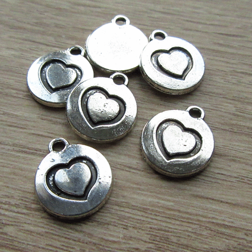 Plat ronde bedel met hartje in reliëf erop..