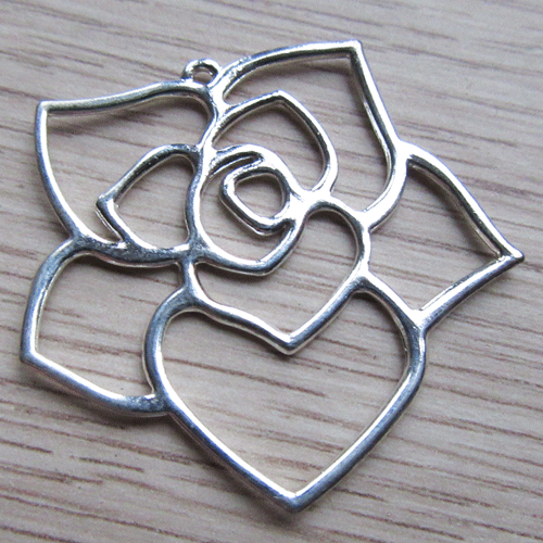 Wat grotere, maar toch fijntjes ogende hanger in de vorm van een bloem. Licht zilverkleurig.