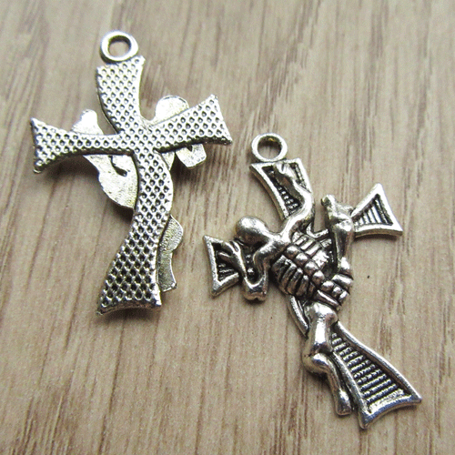 Bedel in de vorm van een skelet die op een kruis klimt.