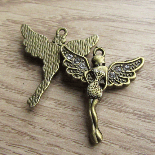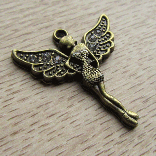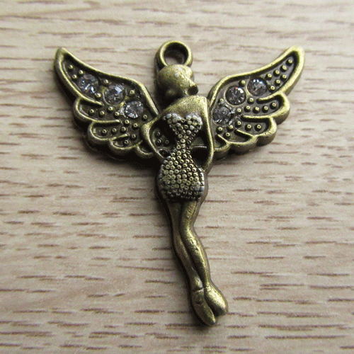 Bedeltje in antiek brons. Leuk zijn de strassteentje op de vleugels.