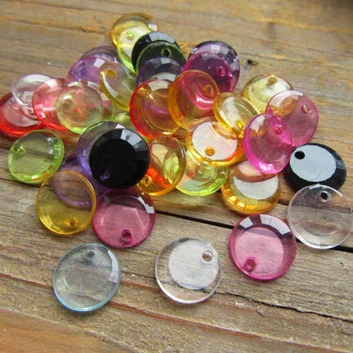 Leuke mix met plat ronde hangertjes. Transparant en in allerlei kleuren. Met deze kleine bedeltjes kun je alle kanten op. Ze zijn ideaal om volle bedelarmbandjes mee op te vullen. Licht van gewicht en vrij klein van maat.